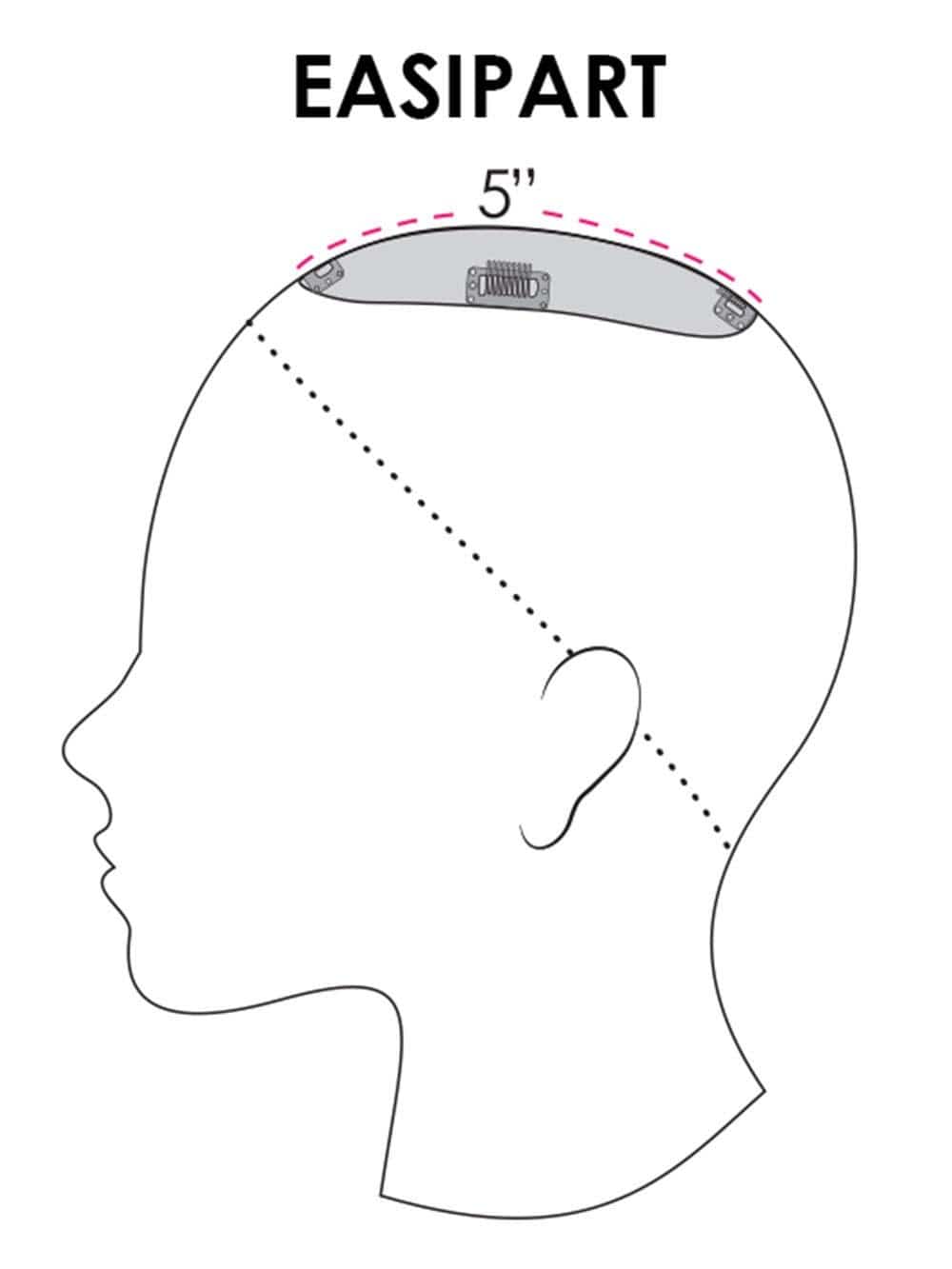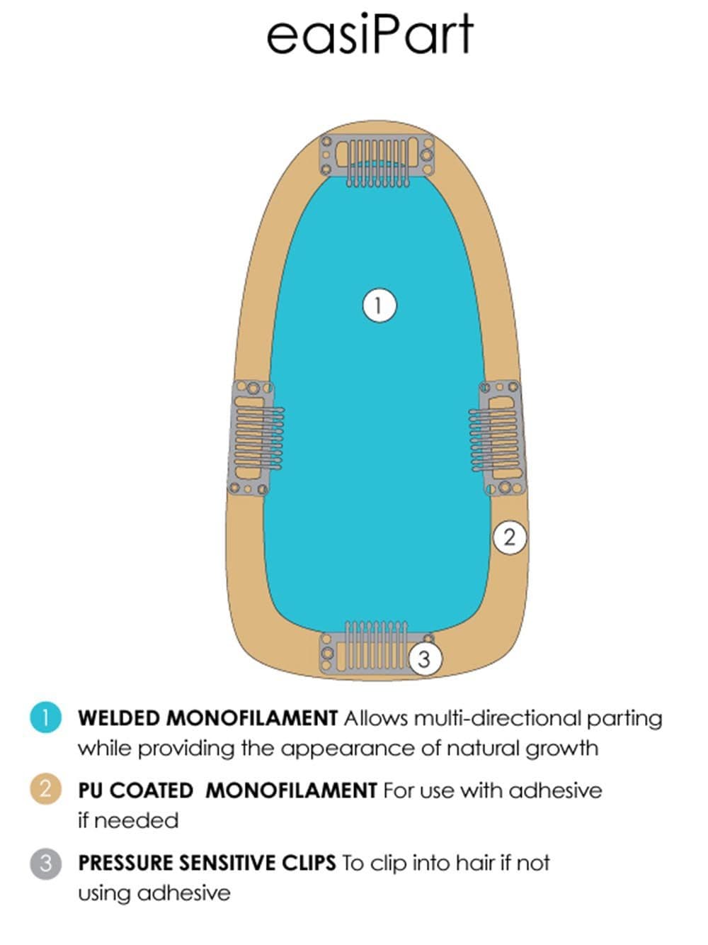 One of my favorites: The easiPart HD 8” by easihair is a heat friendly fiber synthetic topper. It looks and feels like real hair and can be styled with heat tools using low-Med heat (up to 350 degrees). The base size measures 5" by 2.75” and is ideal for adding volume, covering thinning at the part, or concealing new growth between colors. It attaches with 4 pressure sensitive clips and is available in a variety of colors and gray shades.