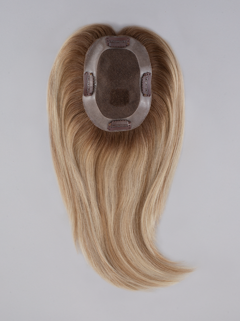easiPart Medium by Jon Renau.   You will love the small base of this topper, which is lightweight and gives you just enough coverage at the top of the head.  The perfect solution if, you’re at the onset or amidst progressive hair thinning.   The  easiPart Medium distinguishes itself with increased density, ensuring a fuller appearance. The base is thoughtfully widened, catering to more expansive coverage. A noteworthy aspect is its larger polyurethane perimeter, which elegantly accommodates the application of Tape ‘N Go or adhesive. easiPart Medium is also available in an 18-inch length.
