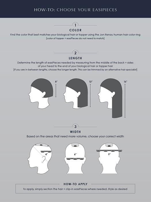 easiPieces are your topper’s best friend! Created to be worn accompanying your topper, easiPieces were simply designed to add subtle, balanced volume that complements a lightweight topper for a full, natural look. However, easiPieces can be worn with or without a topper depending on desired look. Even though this piece is not a hair extension and will not add length to your hair, you can create the look of layers by using the 12” Length and 16” Length pieces. We recommend 4-6 pieces for a full voluminous look. Made with the highest quality Remy Human Hair, easiPieces have a slim, slender polyurethane base, which will give you an undetectable volume.
