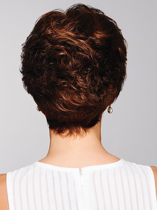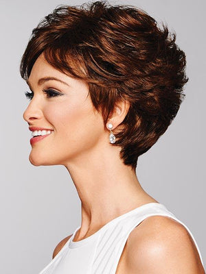 A short, full style, PIXIE THIS by Gabor features softly waved layers throughout. A longer, tapered fringe along both sides allows the wearer to tuck the hair behind the ear or wear it in front of the ear for a softer, face-framing effect. The fullness in the back blends into a short, nape-hugging textured finish.